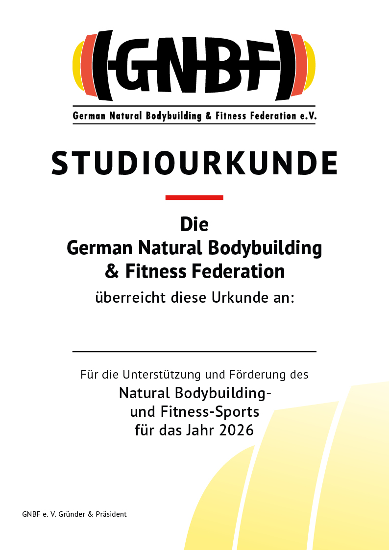 • die GNBF e. V. Studio – Urkunde, welche Auskunft über die Mitgliedschaft in der GNBF e. V. gibt und darüber, dass das Studio / der Body Shop das Natural Bodybuilding in Deutschland unterstützt.